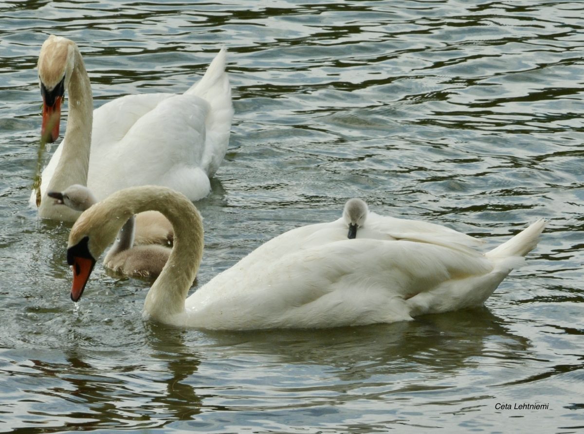Tulostimeni oli juuri kaivannut syväpuhdistusta, koska se ei pystynyt käsittelemään mustaa väriä. Makasin yöllä kuin syväpuhdistettavana. Tämä kuva kyhmyjoutsenista oli mielessäni ja sen vuoksi se on esillä, eikä tulostimen kuva. Mielessäni taisi käydä myös tummasävyisiä ja ahdistavia mielikuvia, mutta nukahdin varsin nopeasti uudelleen ja heräsin levänneenä. Katsopa pientä poikasta hyöhenten suojassa – mikä lepopaikka! Entä toinen pikkuinen, jolle nostetaan ruoka nokan eteen – mitä hellää huolehtimista saammekaan katsella!