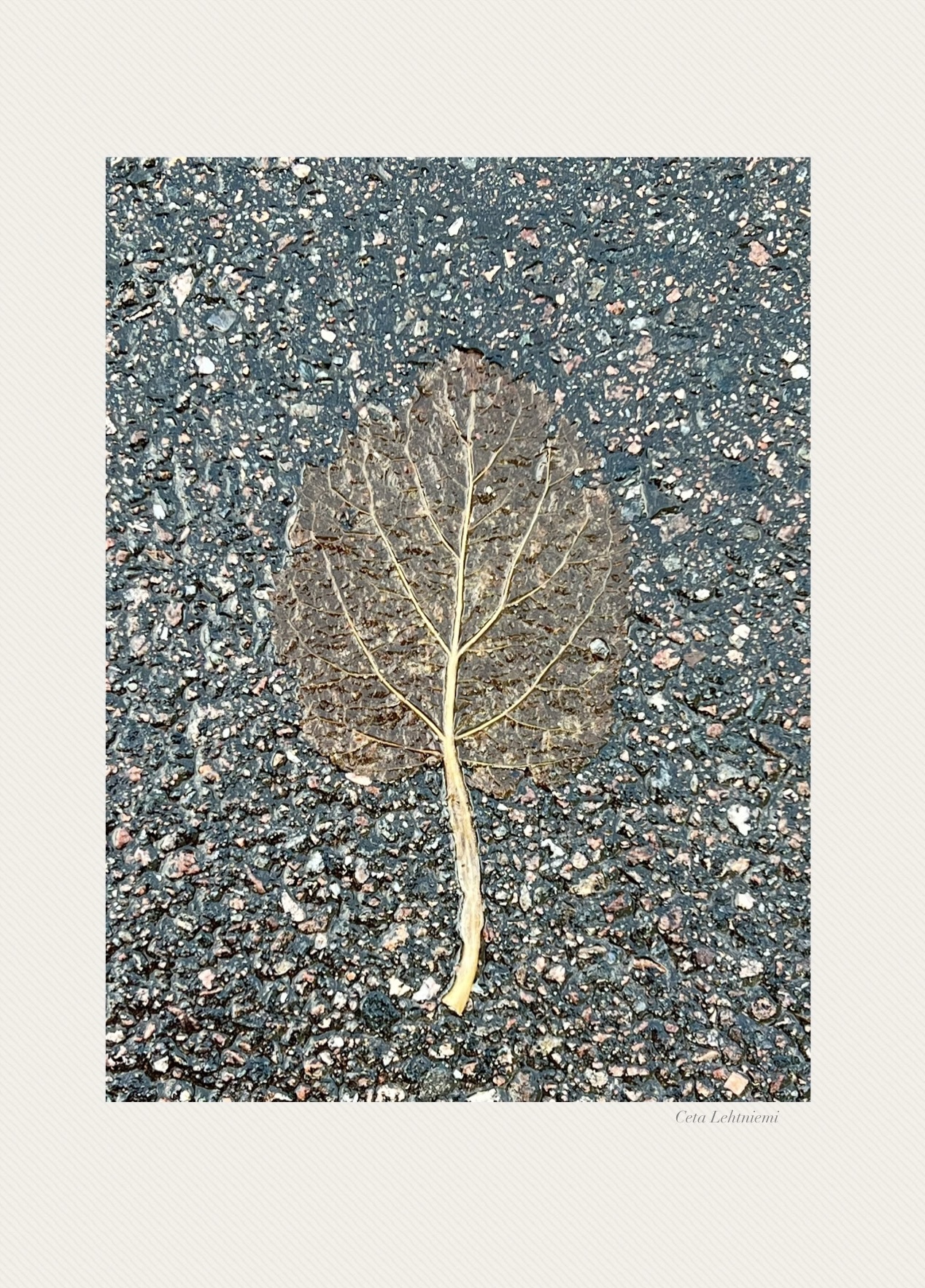 On marraskuinen lauantai ennen isänpäivää. Aamukahvi on juotu. Otin hajamielisenä esiin kuvan puhelimestani. Kuin ohimennen olin nähnyt liiskaantuneen lehden puuna, pysähtynyt ja kuvannut sen. Oli kuva näköjään vielä puhelimessani.