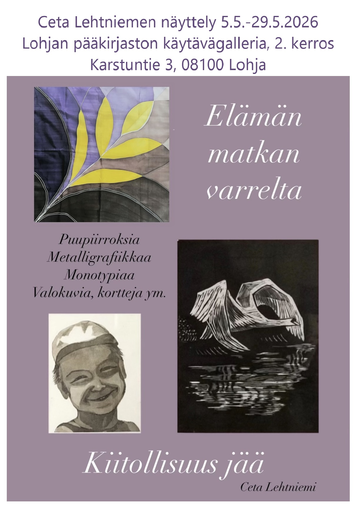 Ihmisen mieli on erikoinen. Kun hiljennyn ja keskityn vaikka käytännön työhön valmistelemaan kauniilla tavalla grafiikan töitäni vitriiniin asettelua varten, ehdin samalla ajatella vaikka mitä. Kuin portti luovuuteen, syvyyteen ja hiljaisuuteen olisi avautunut. Oikeastaan tein eilen A5 pystyn kierrekirjasen mietteistäni/runoistani, vaikka minulla ei olisi ollut aikaa moiseen. Nyt mieleeni tulleet ajatukset ovat kuin ripustettuina tuohon vihkoseen. Laitan pari sivua avattuna esille yhteen näyttelyni vitriineistä. Mietin kyllä saako runossani näkyä hengellisyyteni siten kuin tuossa esiin laittamassani kuvassa/mietteessä. Josko sana Kristus saisi näkyä omassa näyttelyssäni?