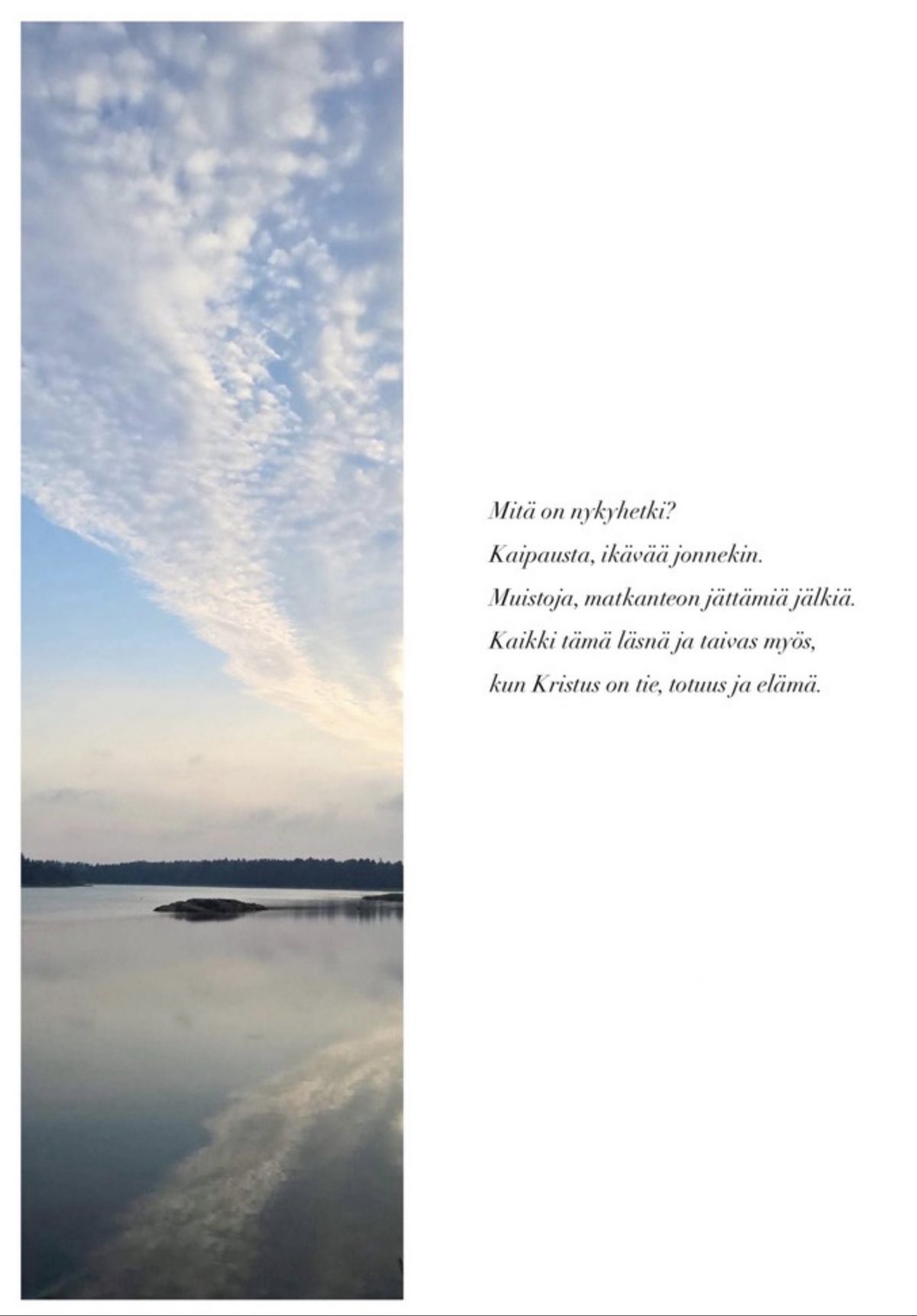 8.4. minulla on myös kuvaesitys Lohjan Seudun Kristilliset Eläkeläiset ry:n Ollaan yhdessä -tilaisuudessa. Samalla ajatukseni tähyilevät jo kauemmaksi kuitenkin keskittymiseni ollessa näihin lähitapahtumiin. Kauemmaksi katsominen on kuin oman mieleni valmistamista.
