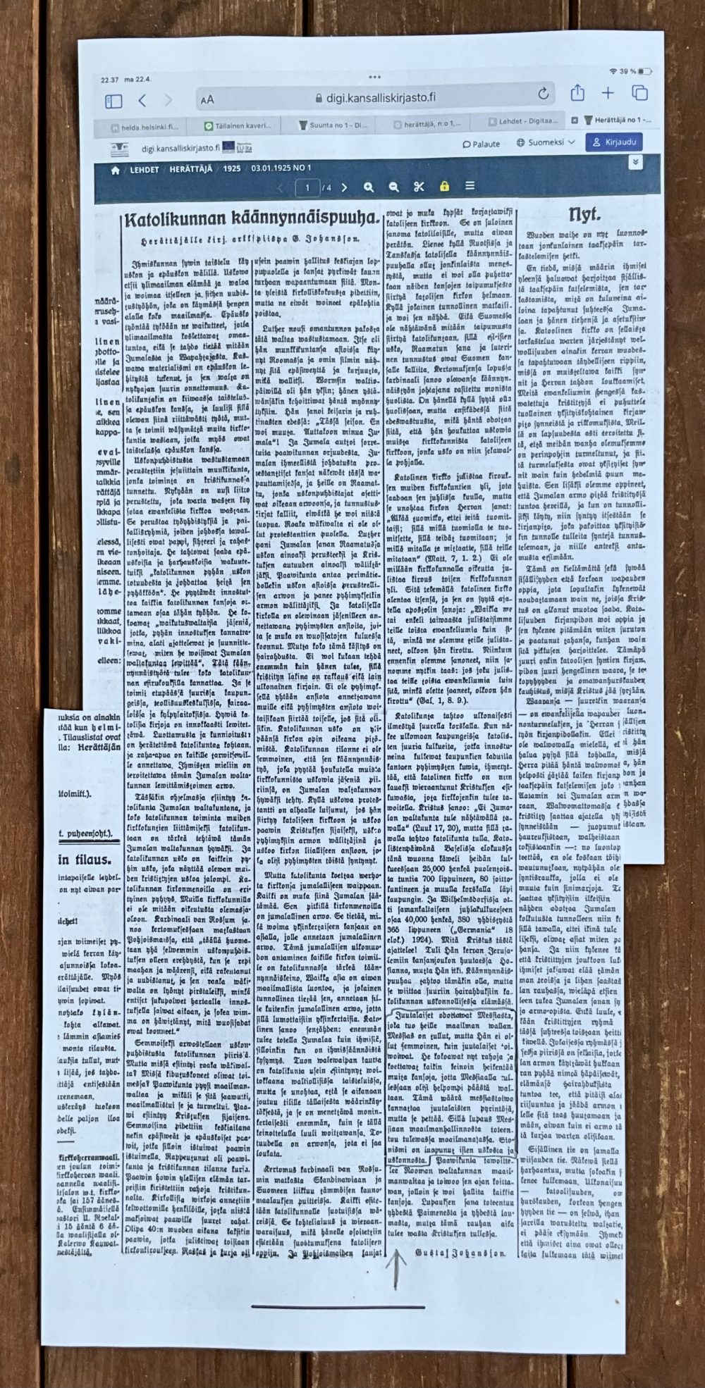 Otin kansalliskirjaston arkistosta esille Herättäjä -lehden 03.01.1925 No 1 Kaksi leikekuvaa liimattuna yhteen pääsin lukemaan Johanssonin artikkelin Katolikunnan käännynnäispuuha. Kuva on sen jälkeen, kun olin asetellut kaksi kopioitua sivua päällekkäin ja teipannut ne kohdalleen. Pääkirjoituksen loppuun on siis päässyt noin 1/20 osa arkkipiispan kirjoituksesta hänen jo kuoltuaan. Tahdon myös painottaa sitä, etteivät luterilaiset papit kirjoittaneet lehteen Tapparamies tai julkaisseet kustantajalla Vasara. Tämäkin arkkipiispa Johanssonin kirjoitus Herättäjä -lehdessä on hengelliseksi ajateltu ja varoitus kohdistuu katolisuuteen eikä niinkään juutalaisuuteen.