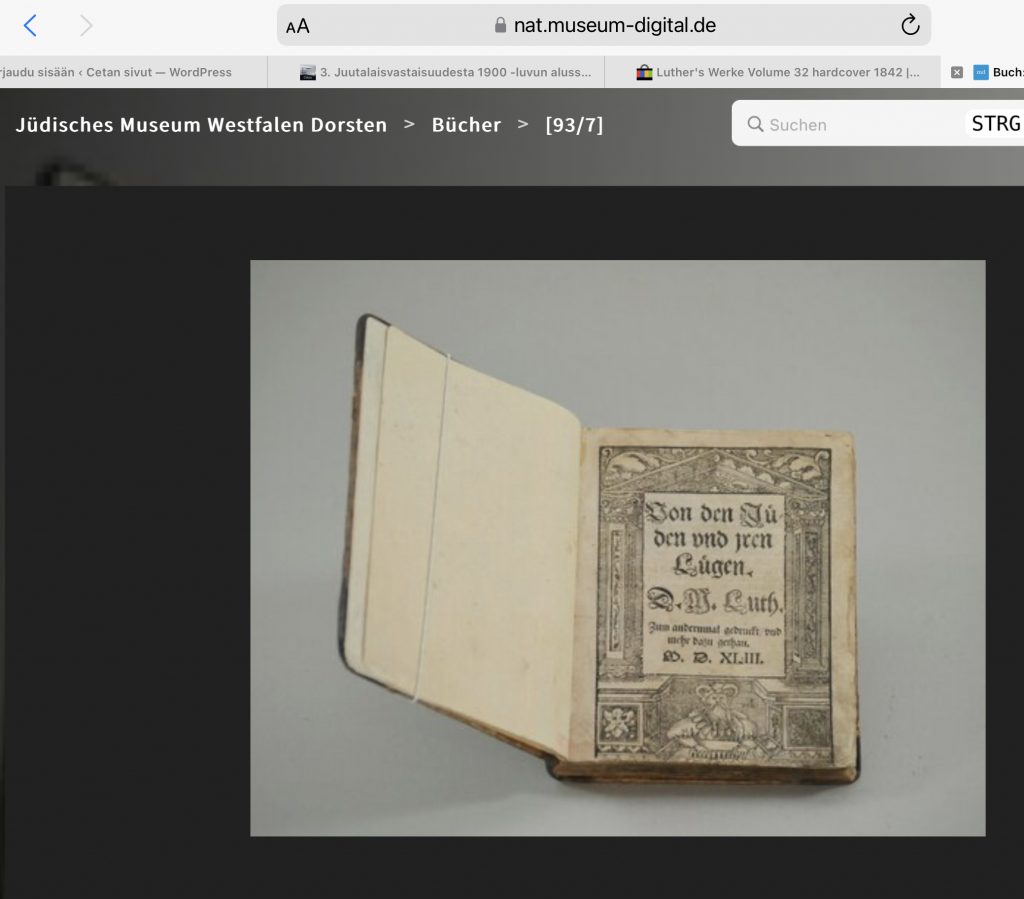 ”Neljäsataa vuotta on tämä Lutherin kirja ollut meiltä kokonaan kätkettynä, sillä ani harvat papeistamme ja jumaluusopineistammekaan ovat tienneet siitä tuskin muuta kuin nimen – eikä ihmekään, sillä onhan se kokonaan jätetty pois Lutherin koottujen teosten myöhemmistä laitoksista … enempi ehkä syystä, ettei tällä Lutherin kirjalla muka enää olisi mitään käytännöllistä arvoa, mutta varmasti myöskin siitä syystä, että se ankarasti kohdistuu juutalaisia ja juutalaisuutta vastaan. Sillä ovathan juutalaiset koko viime vuosisadan ajan olleet kaikkialla maailmassa ainaisessa myötätuulessa.”