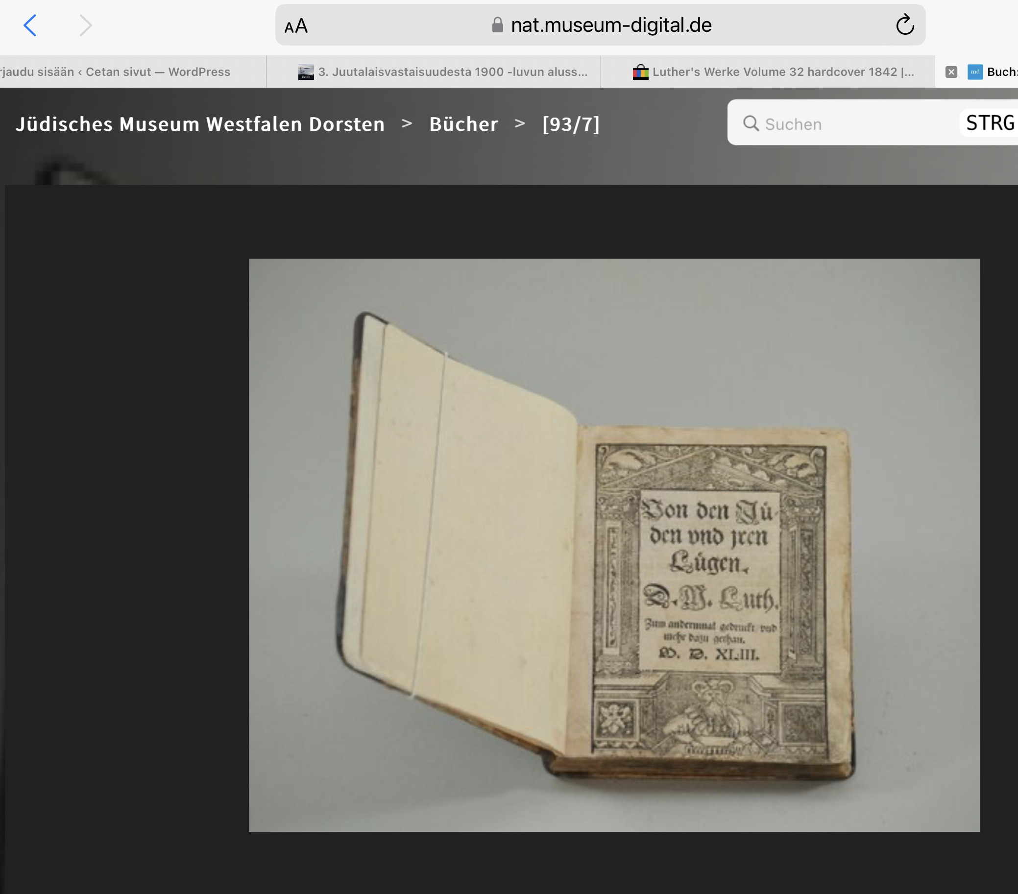 ”Neljäsataa vuotta on tämä Lutherin kirja ollut meiltä kokonaan kätkettynä, sillä ani harvat papeistamme ja jumaluusopineistammekaan ovat tienneet siitä tuskin muuta kuin nimen – eikä ihmekään, sillä onhan se kokonaan jätetty pois Lutherin koottujen teosten myöhemmistä laitoksista … enempi ehkä syystä, ettei tällä Lutherin kirjalla muka enää olisi mitään käytännöllistä arvoa, mutta varmasti myöskin siitä syystä, että se ankarasti kohdistuu juutalaisia ja juutalaisuutta vastaan. Sillä ovathan juutalaiset koko viime vuosisadan ajan olleet kaikkialla maailmassa ainaisessa myötätuulessa.”