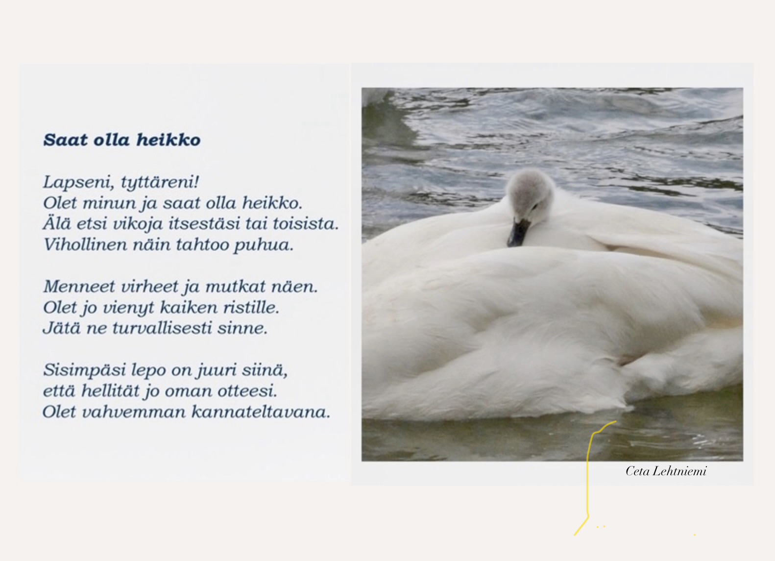 Tulostimeni oli juuri kaivannut syväpuhdistusta, koska se ei pystynyt käsittelemään mustaa väriä. Makasin yöllä kuin syväpuhdistettavana. Tämä kuva kyhmyjoutsenista oli mielessäni ja sen vuoksi se on esillä, eikä tulostimen kuva. Mielessäni taisi käydä myös tummasävyisiä ja ahdistavia mielikuvia, mutta nukahdin varsin nopeasti uudelleen ja heräsin levänneenä. Katsopa pientä poikasta hyöhenten suojassa – mikä lepopaikka! Entä toinen pikkuinen, jolle nostetaan ruoka nokan eteen – mitä hellää huolehtimista saammekaan katsella!