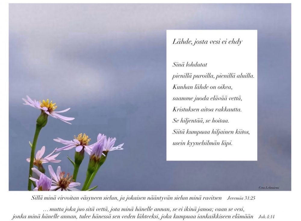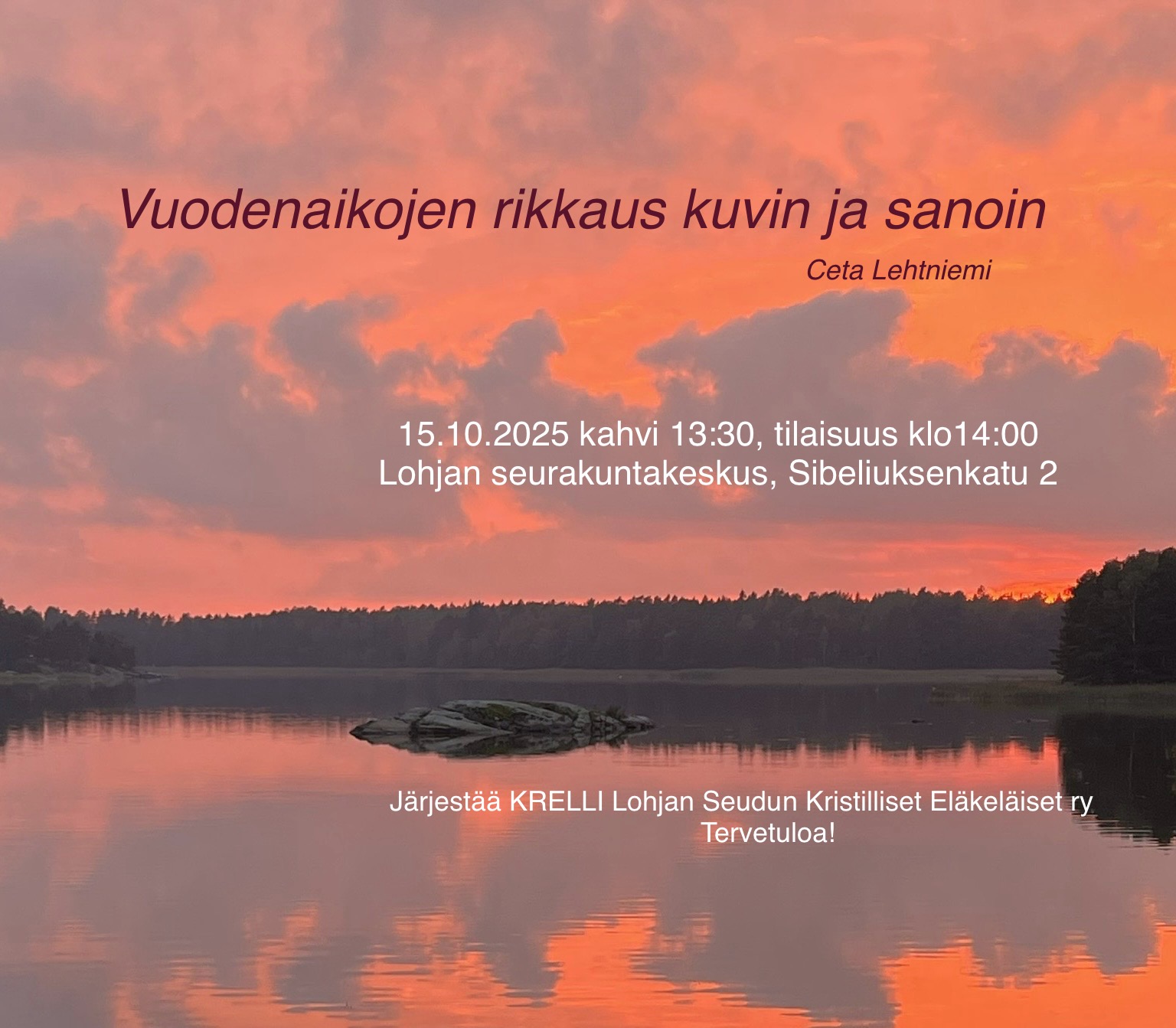 28.8.24 olen Lohjan seurakuntakeskuksessa Sibeliuksenkatu 2 Lohjan Seudun Kristilliset Eläkeläiset ry:n tilaisuudessa puhumassa aiheesta ”Kuvat ja runot hyvän sanoman tuojina”.