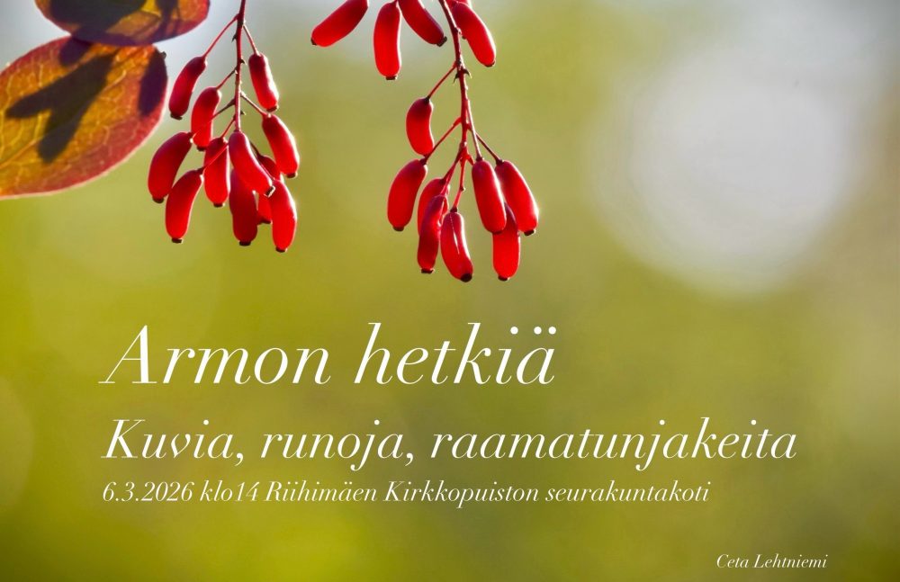 Armon hetkiä. Kuvia, runoja, raamatunjakeita. Sain aikaa 45 minuuttia, mutta teen 35 – 40 minuutin esityksen.