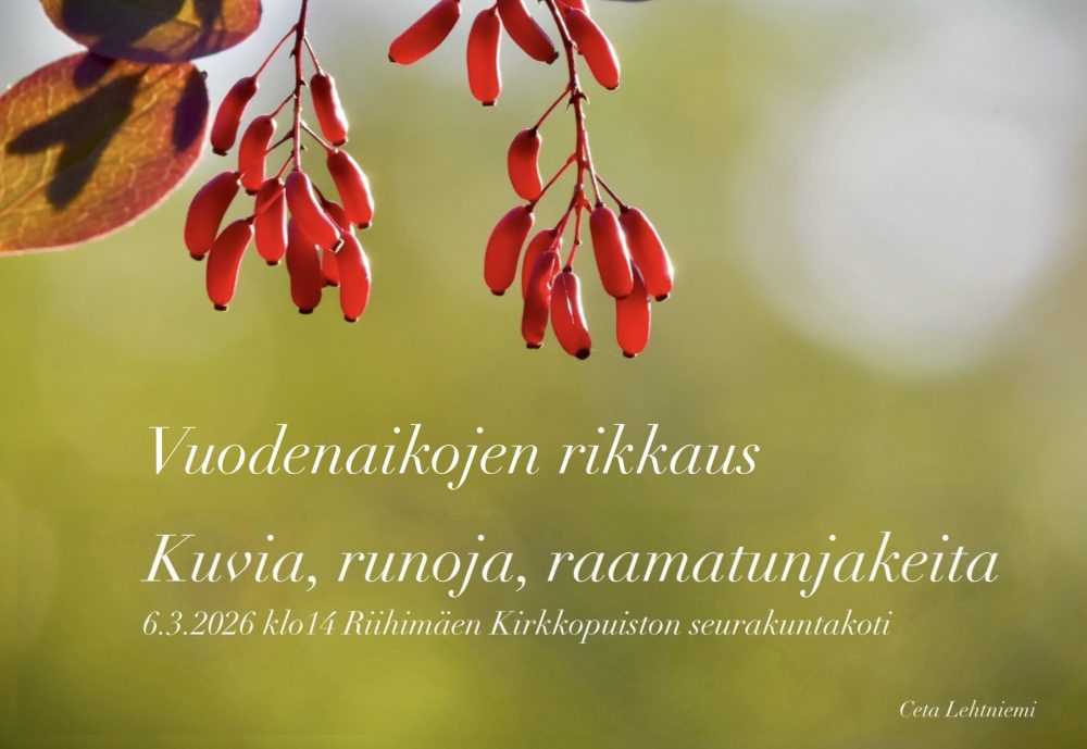 Saan käyttää 30 minuuttia esitykseeni, jonka toki tahdon olevan enemmän kuin esitys. Se on yhteinen yhdessä olon matka. Suurin osa runoista ja kuvista on kirjasestani ”Pieniä siemeniä erämaasta”. Yllättävän harva on jaksanut kuunnella ja katsella tätä YouTubeani: https://youtube.com/playlist?list=PLMGZlIjGywfb10tl9t-h9go_LD3_0jssi&si=Y2vMLO_sdoJAcooO